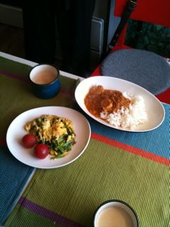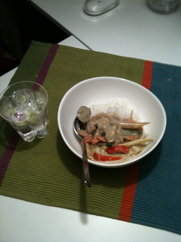 鶏肉と筍と赤パプリカと茄子の入ったグリーンカレーと水